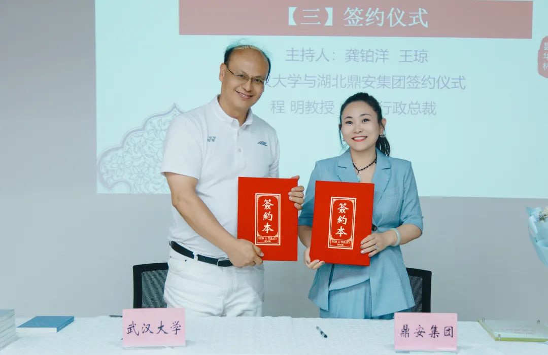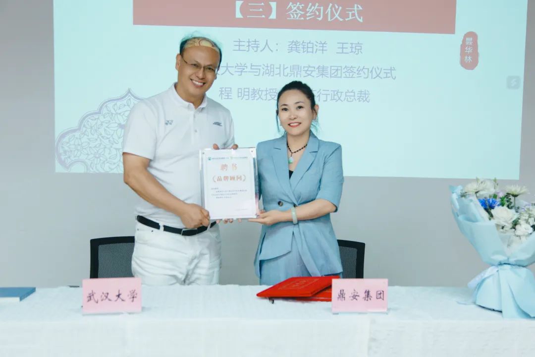 簽約環節,程明教授與胡芬總裁分別代表武漢大學與鼎業安環科技集團簽署品牌顧問協議。