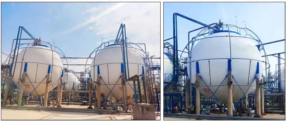 (1)成品油罐區(qū)技改項目中,針對丙烯球罐、丙烷球罐及液化氣球罐的隔熱需求,創(chuàng)新采用再生循環(huán)保溫材料實施整體隔熱改造。單臺球罐施工面積達2190平方米,改造后實測降溫幅度超12℃,顯著提升設(shè)備運行穩(wěn)定性,驗證了該材料在大型儲罐領(lǐng)域的優(yōu)異隔熱性能。